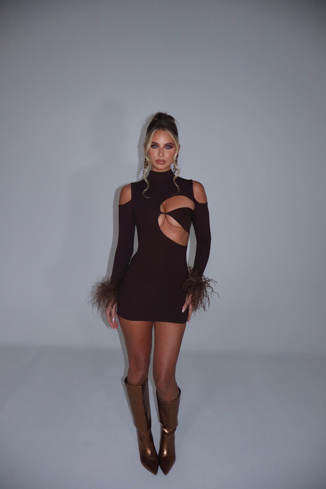 MADE TO ORDER: BLAIR Ribbed Dress with Feather Cuffs (Brown)